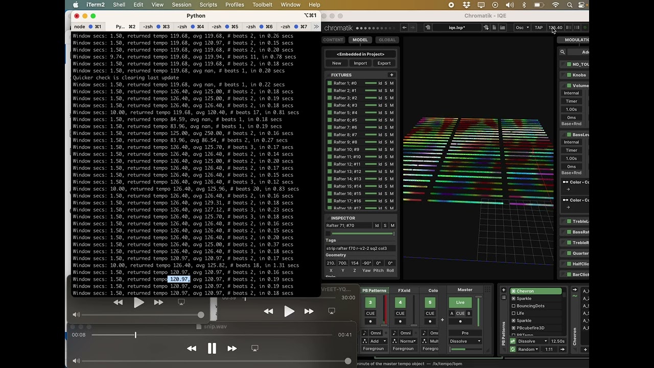 Those events are sent to LX Studio / Chromatik (a.k.a. the Ableton Live of light) and I have a simple custom pattern (radiating circles) firing from these beat events. We used this live with our beautiful LEDs here as well.